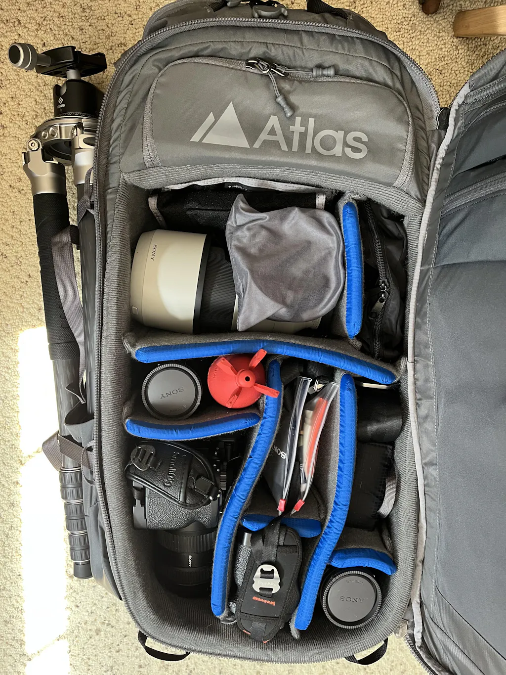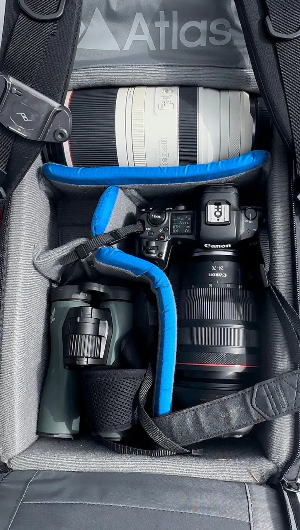 I had an opportunity to take my Atlas Pack out on a steep trail and was very impressed by how it felt and performed. My Nikon Z8 with the 180-600 mm lens attached fit well in the large compartment.